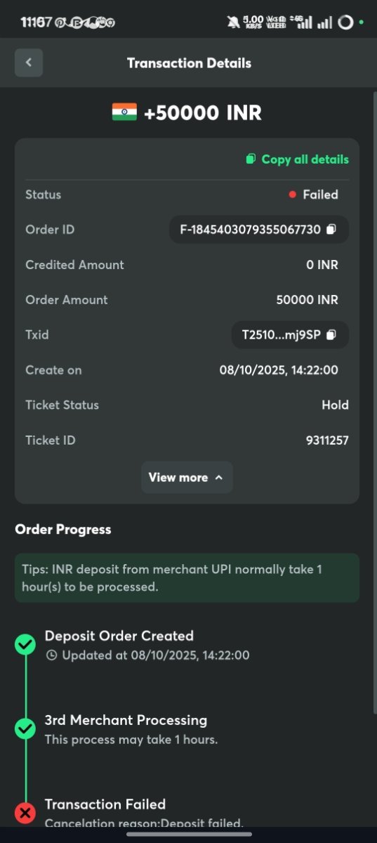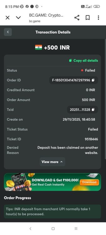 Hello BC.Game Support Team & Moderators, I urgently need help with a deposit that has been pending for over 12 days now. Deposit Details: • Amount : ₹5,000 INR (Fiat via UPI) • Deposit Date : 24 November 2025 • Transaction ID : T2511...a97sn (full Tx ID in screenshots) • Order ID : F-184... (visible in screenshots) • Support Ticket ID : #9491468 • Actions taken : Already submitted “Speed Up the Deposit” + Manual Credit Request on 1 December 2025, but still no reply and no funds credited. All details attached on ticket I am not able to upload file please check this ticket or help me