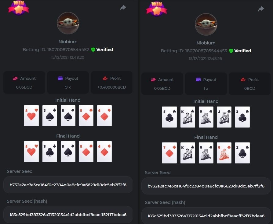 18. $1k Prestige Video Poker Challenge #9 Welcome back, Dear players! We are excited to announce the ninth Prestige event for any level VIPs at BC.Game. The game selected this week is in-house Video Poker, with a total prize pool of $1,000! Get the most consecutive wins at Video Poker and challenge yourself to hit the highest points possible (more details below). What's the Challenge? Win as many hands as possible in a row without losing at Video Poker, the points will be based on each payout reached in consecutive wins. For example: If the participant wins the Full House hand and then Jacks or Better, the point total will be 10. In case of loss, counting must start again. If there is a tie, the player with the higher average bet amount (in USD) shall be the winner. If there is a tie in the amount and payout, the one who posted or edited his post first will be considered in the Ranking. Minimum VIP There's no minimum VIP level Minimum Bet Size $0.05 USD equivalent Eligible Coins All coins are eligible (excepting JB) Available Prizes 1st Place....... $400 2nd Place..... $200 3rd Place...... $100 4th Place......$50 5th-15th.........$20 How to Enter To enter, copy the bet ID of the bet you'd like to submit. Once you've copied it, post it as a reply to this thread like so: Betting ID: 1807008705544452 - 1807008705544453 In the same post, upload a screenshot of your win by clicking the game ID WITH VIEW IN USD mode ENABLED (accessible at the bottom of dropdown menu for your wallet up top. This way, we can ensure that your bet indeed met the minimum requirement at the time of placing it: Total Points: 10 Please combine all of your hits together in a SINGLE post. Edit your existing post for additional hits, don't create a new post. Bets must be posted within 24 hours of placing bet in order to keep things fair for everyone. Bets must be made during the specified time window stated above. This thread will lock automatically when the time period is over. One (1) entry per household. Anyone found attempting to win multiple prizes will be disqualified from this challenge as well as all future challenges. Failure to follow instructions will result in your submission being null and void. By entering this challenge, you acknowledge that BC.Game has the final decision on results and placement. Payouts will be made within 72 hours of challenge completion, please be patient, we promise you that we haven't forgotten. We check and double check to make sure the rightful winners receive their prize. Prizes will be paid out in BCD. Good luck everyone!