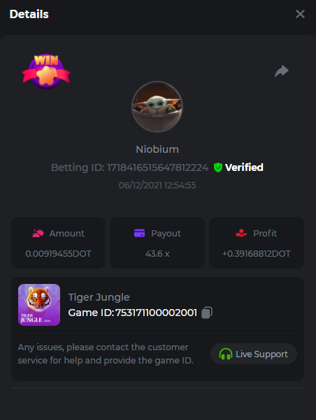 2. Greetings, VIPs! We are excited to announce a new live game release on our platform! And we couldn't miss the chance to challenge you all in another weekly battle, with a prize pool of up to $5,000! Brand game from Evolution provider is on our website, Bac Bo. This game is a mix between Sic Bo & Baccarat. Plus, any participant who completes the side bounty will receive an equal share of 10% of the prize pool (details further down). What's the Battle? Complete as many tied bets as possible on Bac Bo Live throughout this week (Maximum 25 points). Six, seven, and eight ties award a payout of 4:1 Five and nine ties pay 6:1 Four and tens result in a prize of 10:1 Three and eleven pay 25:1 Two and twelve award a prize of 88:1 Each tied bet you hit counts as 1 point. If there's a tie between the total points of the participants, the competitor with the higher average bet amount (in USD) shall be the winner. Minimum VIP Tier Must be VIP08 or higher in order to enter this event. Minimum Bet Size $1.00 USD equivalent (in any cryptocurrency). Eligible Coins All coins are eligible (excluding JB) Prize Pool & Reward Breakdown The winners will win a share of the prize pool based on the detailed ranking below. Anyone who completes the side bounty will receive a share of a 10% of the prize pool. BOUNTY - Post a win that shows the 88:1 tied bet within the timeframe of this Battle and receive a share of 10% of the prize pool! If nobody gets 88:1 the player/s that complete at least 12 tied bets will win this bounty! How to Enter To enter, copy the bet ID of the bet you'd like to submit. Once you've copied it, post it as a reply to this thread like so: Betting ID: 1721755777891782528 In the same post, upload a screenshot of your win by clicking the game ID WITH VIEW IN USD mode ENABLED (accessible at the bottom of dropdown menu for your wallet up top. This way, we can ensure that your bet indeed met the minimum requirement at the time of placing it: Example post - Betting ID: 1721755777891782528 Good luck to everyone!