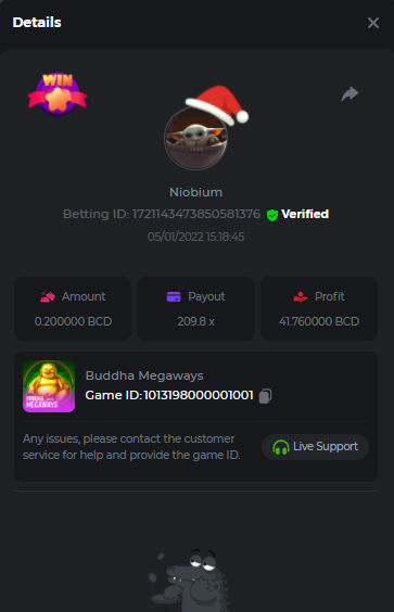 16. Get your ho ho ho on, Santa's on his way! And what we like about Christmas is that you can make people forget the past with the present. This week we're going to the BGaming slot event, and our present to you is a prize pool of up to $5,000! Players need to reach the highest payouts in the 5 Slots selected below, and payments will be summed together to rank. Any participant who completes the side bounty will receive an equal share of 10% of the prize pool. Eligible Games Win the highest multiplier on the BGaming slots listed below Bonanza Billion Fruit Million (XMAS) Candy Monsta (XMAS) Aloha King Elvis Xmas Road2Riches The highest multiplier reached in each slot will be added together and counted as total points. If the player submits multiple winning entries for the same slot, the entry with the highest multiplier will be valid. Minimum VIP Tier Must be VIP08 or higher in order to enter this challenge. Minimum Bet Size Bonanza Billion - $0.20 Fruit Million (XMAS) - $0.20 Candy Monsta (XMAS) - $0.20 Aloha King Elvis Xmas - $0.25 Road2Riches - $0.10 Eligible Coins All cryptocurrencies are eligible (excepting JB) Prize Pool & Reward Breakdown The winners will win a share of the prize pool based on the detailed ranking below. Anyone who completes the side bounty will receive a share of a 10% of the prize pool. BOUNTY - Post two bets that show exactly 25x & 31x payout on any of the 5 slots within the timeframe of this event and receive an equal share of 10% of the prize pool! If nobody gets exactly 25x - 31x, the person/s closest to both numbers will win this bounty! How to Enter To enter, copy the bet ID of the bet you'd like to submit. Once you've copied it, post it as a reply to this thread like so: Betting ID: 1719671360592960263 In the same post, upload a screenshot of your win by clicking the game ID WITH VIEW IN USD mode ENABLED (accessible at the bottom of dropdown menu for your wallet up top. This way, we can ensure that your bet indeed met the minimum requirement at the time of placing it: Example post - Betting ID: 1719671360592960263 Let's all make it a Christmas to remember! Merry Christmas and Good luck!
