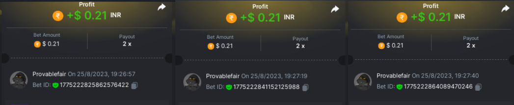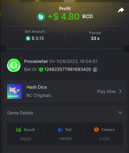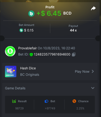15. 22x 0.15$ - https://bc.game/#/sd/11FOS8Q84IM9YB - Bet ID: 124823577961693305 33x 0.15$ - https://bc.game/#/sd/11FOSULG15JLT3 - Bet ID: 124823577961693420 44x 0.15$ - https://bc.game/#/sd/11FOTZOPD4ZD8R - Bet ID: 124823577961694600