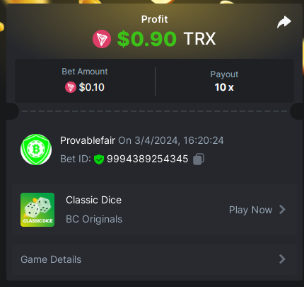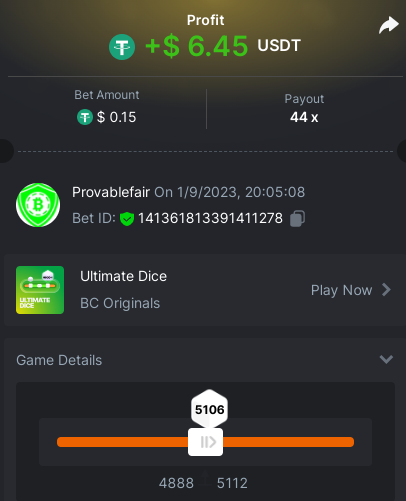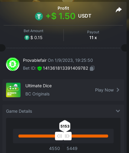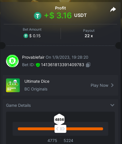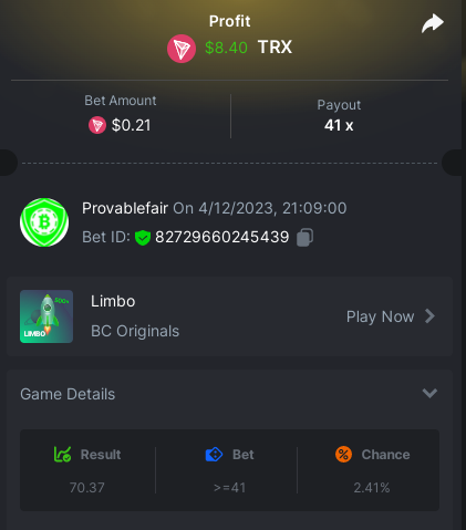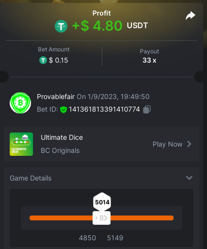 4. bet 0.21$ - 50x - Hash Dice - https://bc.game/#/sd/11QN6R5L1JDVQJ - Bet ID: 124823577961695244 bet 0.21$ - 50x - Limbo - https://bc.game/#/sd/11QN8527NJ49ZV - Bet ID: 82729660290963