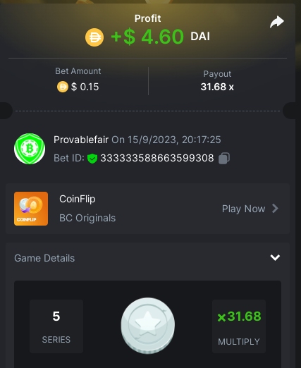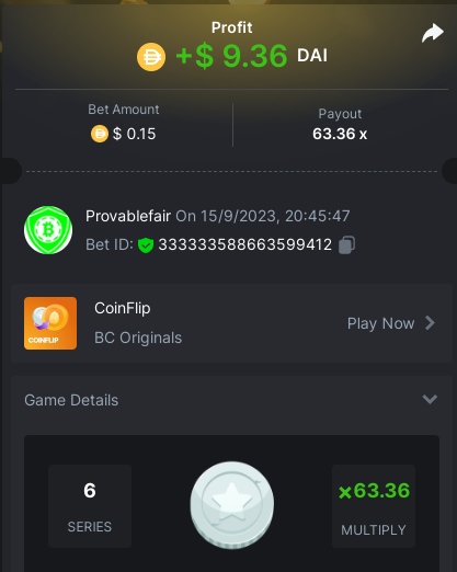8. $ 0.15 - 5 SERIES - Payout 31.68 x - https://bc.game/#/sd/11I6FYAEN0V42F - Bet ID 333333588663599308 $ 0.15 - 6 SERIES - Payout 63.36 x - https://bc.game/#/sd/11I6HP4DJW705B - Bet ID 333333588663599412