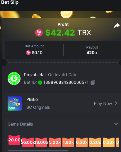 5. 20x - bet amount:0.32$ - Bet id: 9994389253566 - Bet link: https://bc.game/#/sd/11P1R1UXL5GQ4N
