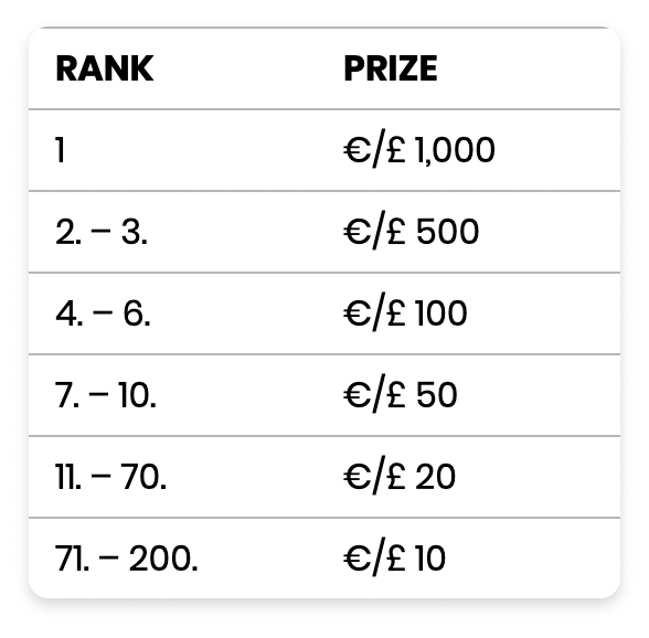 DURATION: 1st MAR - 26th APR PRIZE POOL: $100,000 Spinomenal's new Grand Tour tournament is now available at BC.GAME with amazing $100,000 worth cash prize pool! Below you will find out the details of rounds and reward distribution methods below! Don't miss out on this amazing opportunity to make some extra cash while you are enjoying the games! Terms and conditions will remain same for the whole tournament: How to Participate Each win rewards the Player with a score based on the win multiplier (for example, if you waged $1 and won $10, you will be rewarded with 10 points). The more points you collect, the higher your position will be on the leaderboard. You can see the leaderboard in the participating games to check the scores and more details about the tournament. Don't forget to check below General terms section for all the rules. Participating Games Round Details Round Round name Dates Prize Pool Number of Winners 1 Lucky Lady 1st MAR - 8th MAR €10,000 70 2 Beer Race 9th MAR - 15th MAR €10,000 70 3 Patrick’s Lucky Week 16th MAR - 22nd MAR €10,000 70 4 Blooming Luck 23rd MAR - 29th MAR €10,000 70 5 Egg Hunt 30th MAR - 5th APR €10,000 70 6 Fields of Wins 6th APR - 12th APR €10,000 70 7 Gold Seeker 13th APR - 19th APR €15,000 90 8 The Final Showdown 20th APR - 26th APR €25,000 90 Prize Pool Distribution ROUNDS 1-6 ($10,000 each round) From Place To Place Prize Sum 1 1 $1,600 $1,600 2 2 $1,400 $1,400 3 3 $1,200 $1,200 4 4 $1,000 $1,000 5 5 $800 $800 6 6 $500 $500 7 7 $400 $400 8 8 $300 $300 9 9 $200 $200 10 10 $100 $100 11 20 $70 $700 21 30 $55 $550 31 40 $40 $400 41 60 $30 $600 61 70 $25 $250 ROUNDS 7 ($15,000) From Place To Place Prize Sum 1 1 $2,000 $2,000 2 2 $1,800 $1,800 3 3 $1,600 $1,600 4 4 $1,400 $1,400 5 5 $1,200 $1,200 6 6 $900 $900 7 7 $800 $800 8 8 $600 $600 9 9 $400 $400 10 10 $200 $200 11 20 $110 $1,100 21 30 $80 $800 31 40 $60 $600 41 60 $40 $800 61 70 $30 $300 71 90 $25 $500 ROUNDS 8 ($25,000) From Place To Place Prize Sum 1 1 $2,500 $2,500 2 2 $2,300 $2,300 3 3 $2,000 $2,000 4 4 $1,800 $1,800 5 5 $1,600 $1,600 6 6 $1,200 $1,200 7 7 $1,100 $1,100 8 8 $1,000 $1,000 9 9 $800 $800 10 10 $600 $600 11 20 $300 $3,000 21 30 $200 $2,000 31 40 $120 $1,200 41 60 $90 $1,800 61 80 $80 $1,600 81 90 $50 $500 GENERAL TERMS 10% of the score each Player gains during each Tournament round will be collected as credit points and added to the Player’s score in the final round (Round 8). Each Player’s rank in the Leaderboard for each round will appear once they reach the qualifying score, as displayed on the Players’ toolbar. The Tournament is available during real-money play only. Minimum qualifying bet per spin to participate in the Tournament is 0.2 EUR (“Minimum Qualifying Bet”). If the Minimum Qualifying Bet is not available on one of the Participating Games, the closest higher bet amount shall constitute as the Minimum Qualifying Bet for that game. No additional deposits or costs by Players are required to participate in the Tournament. Participation in the Tournament is automatic once a Player waged at least a Minimum Qualifying Bet in one of the Participating Games. By qualifying for the Tournament and playing the games, each Player agrees to these terms and conditions and to all other terms and conditions set by the Operator hosting this Tournament. Each Player participating in the Tournament will receive a unique Tournament ID for the Leaderboard, per each currency that Player plays with. Changing the currency during the duration of the Tournament may reset the Player’s progress on the Leaderboard. If two or more Players have the same number of points at the end of each round, the Player who reached the points first will be ranked higher. Prizes for Players playing the Games with Cryptocurrencies will be displayed in EUR. Participating Operators will disburse prizes in accordance with their payment terms. Only finished spins will qualify for the Leaderboard. During the Tournament, Players may be offered to play the Participating Games as part of various promotional efforts made available from time to time in accordance with the terms of such efforts. By participating in such efforts, Players may be rewarded with additional points. All amounts are displayed in-game in the currency each Player wages with. Any exchange rates shall be calculated based on Spinomenal’s internal exchange rate. The rules, terms, and conditions of the tournament are subject to all applicable laws and can be changed at any time upon prior written notice to Players participating in the Tournament. Players’ continued participation in the Tournament following such notice shall constitute its acceptance of such changes. The Operator together with its partners reserves the right to stop the Tournament at any time for an indefinite period without paying the prizes. In case of discrepancy of interpretation of the English version of these Terms and any other versions or iterations of these Terms because of difference in translation, this English version shall prevail. Spinomenal reserves the right to stop the Tournament at any time for an indefinite period without paying the prizes, where it reasonably believes that continuing the Tournament will cause harm to Spinomenal, Players or, an Operator. The rules, terms, and conditions of the Tournament can be changed at any time, in accordance with Spinomenal’s sole discretion.