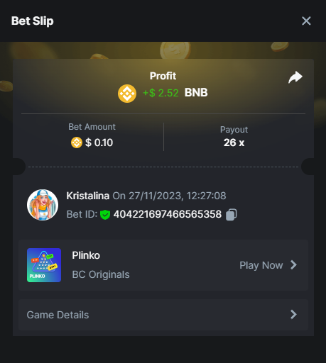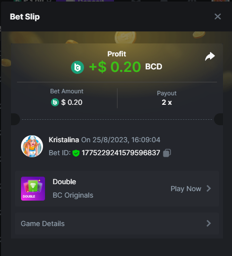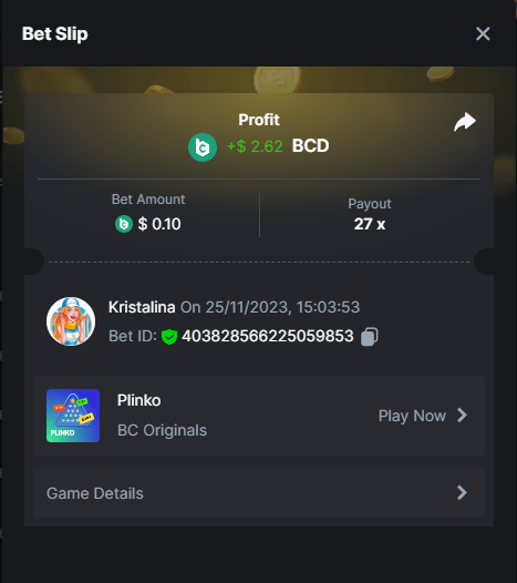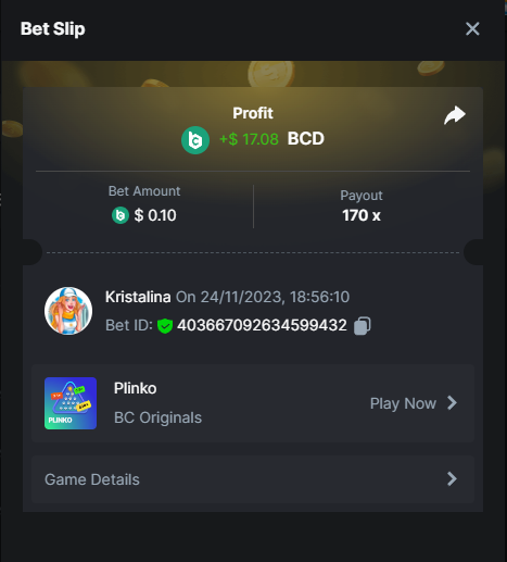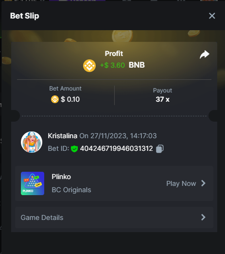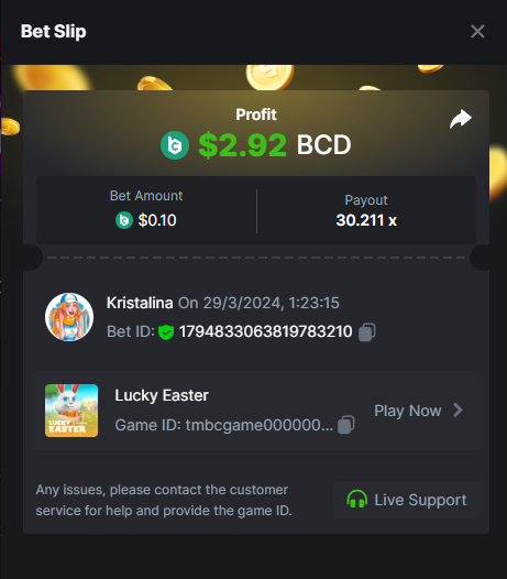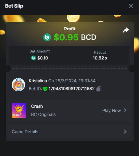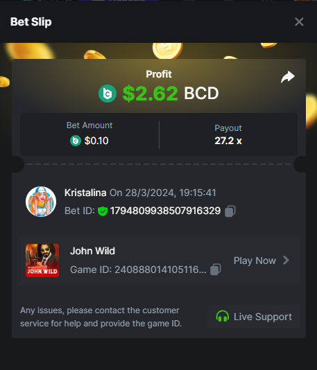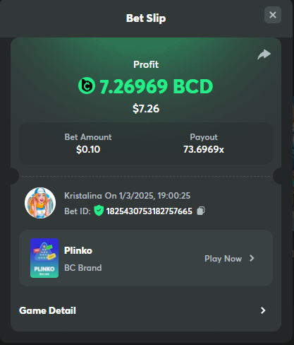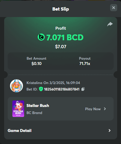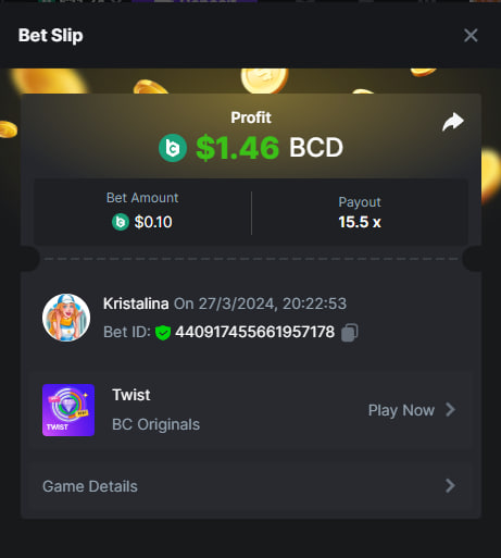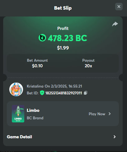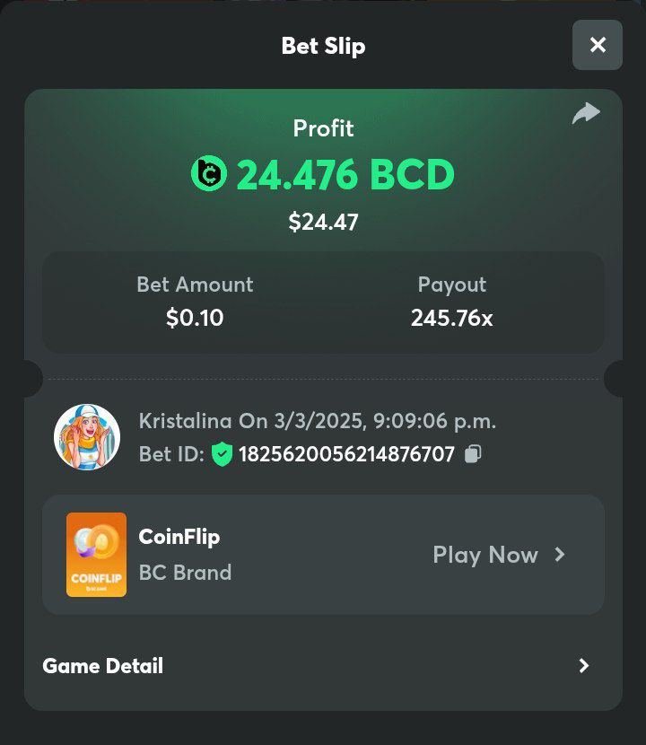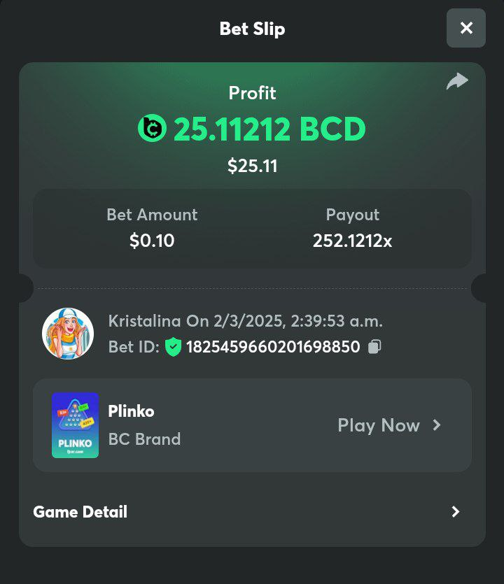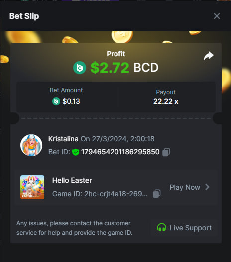 Easy 1. Deposit Txid: 4434113e293eb472a7b171d17fbe54cbfb34631824705869716f789ec0040181 2. Instagram: @LincesaMdq 3. Instagram Post: https://www.instagram.com/p/DHXgr4JspCP/?igsh=ZWgwenpqYXVreTF 4. Twitter: @Kristalinauwu 5. Like, retweet & tag: @Kristalinauwu https://x.com/Kristalinauwu/status/1901728054969274750 6. Follow BCGame Facebook: Gisela Gall 7. Limbo: https://bc.co/game-detail/1825513481832927011 8. Sports bet: Ticket ID: 2513820866270339253 9. Arabian Secret: https://bc.co/game-detail/1825439374915515681 10. Sugar Fiesta 1000: https://bc.co/game-detail/1825441146495751971 11. 2FA activated: Medium 1. Deposit TxID: 4d707ead402ff5771e270374a5fc42f5798fdc6bd13d6bf975996a5316cb53ff TxID: 39d9776a52287c2bdc8bea45c1a751ae618ef4976ed8907766ce39ac0603937f 2. Crash: https://bc.co/game-detail/1825546630112045702 3. Plinko: https://bc.co/game-detail/1825430753182757665 4. Roulette: https://bc.co/game-detail/1825527742035924514 5. Starshine Princess 1000: https://bc.co/game-detail/1825598330617384993 6. Stellar Rush: https://bc.co/game-detail/1825601183186807841 7. Keno: https://bc.co/game-detail/1825612623614982433 8: Poker Ways: https://bc.co/game-detail/1825547398747784483 9. Wukong: https://bc.co/game-detail/1825595350268898850 10. Lottery and Porsche tickets: 11. Sports bet Combo Ticket ID: 2512055034057994476 Hard 1. Wheel: https://bc.co/game-detail/1825529693239491107 2. Crash: https://bc.co/game-detail/1825774085023770502 3. CoinFlip: https://bc.online/game-detail/1825620056214876707 4. Stellar Rush: https://bc.co/game-detail/1826242186137422626 5. Plinko: https://bc.co/game-detail/1825459660201698850 6. Limbo: https://bc.online/game-detail/1826864347105905955 7. Hashdice: https://bc.online/game-detail/1826862839661034018 8. Sea of Olympus 1000: https://bc.co/game-detail/1825539068560977186 9. Gold of Olympus: https://bc.online/game-detail/1826344599486243619 10. Duck Hunter: https://bc.co/game-detail/1825605420251285539 11. Sports bet combo Ticket ID: 2513187573116055908