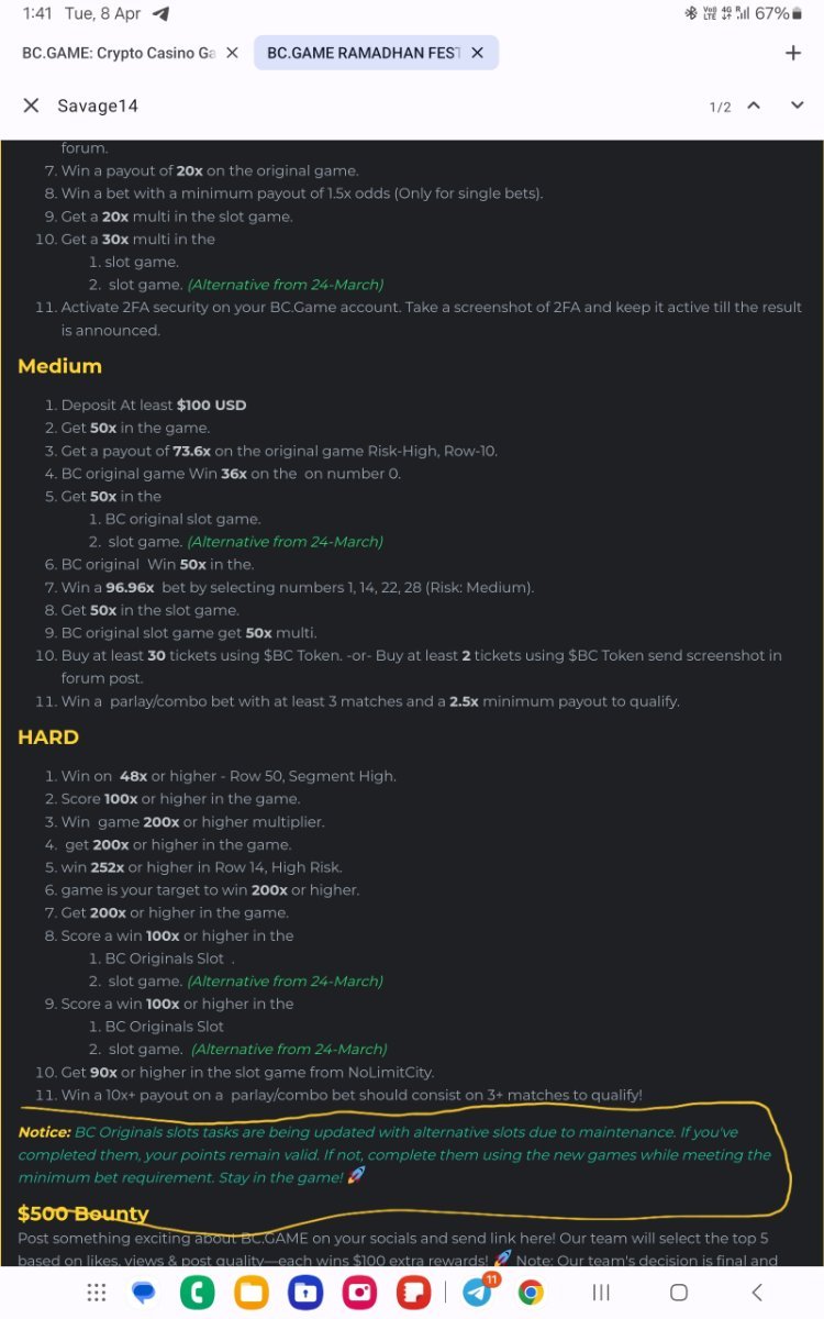 Easy 1. Instagram follow Id https://www.instagram.com/savage1writer/# 2. Twitter or X.com follow Id @WhatsGoingOn011 3. Win a payout of 20x on the original game. https://hash.game/game-detail/1825952008734537762 4. Get a 30x multi in the slot game https://hash.game/game-detail/1825953465141511714 5 Medium 5. Get a payout of 73.6x on the original game Risk-High, Row-10 https://hash.game/game-detail/1825954337084186145 6. BC original game Win 36x on the on number 0 https://hash.game/game-detail/1825943152130789410 7. BC original Win 50x in the. https://hash.game/game-detail/1825943860832915489 8. Win a 96.96x bet by selecting numbers 1, 14, 22, 28 (Risk: Medium https://hash.game/game-detail/1825945564570078754 9. Get 50x in the slot game https://hash.game/game-detail/1825952439030200353 Hard 10. Win on 48x or higher - Row 50, Segment High https://hash.game/game-detail/1825942540351355938 11. Win game 200x or higher multiplier https://hash.game/game-detail/1825954831090586657 12. BC Originals Slot score a win 100x or higher https://hash.game/game-detail/1825952999477367842 For Bounty https://x.com/WhatsGoingOn011/status/1906551439427584341