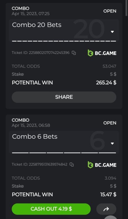 6/30(tasks) Easy 1 - classic dice, 5x https://bc.game/#/sd/117GPUOPWCUIOJ 2 baccarat, tie, 9x https://bc.game/#/sd/117GQAQ5DT3YFN Medium 3 - sports, 1$, odds 2.86x 2258128995407241699 Easy 4 - Egyptian, 27x https://bc.game/#/sd/117H9B3UPBBITV 5 - sports, 1$, 1.76 x multi 2258195397564567966 Hard 6 - sports, 1$, 10x odds 2258709433397940418