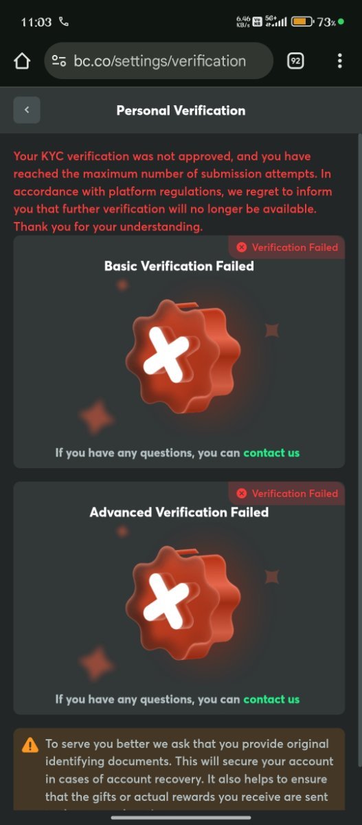 1. Username : Jaertfgvxvcc Email : [email protected] Region: india Sir I had applied for KYC but due to some reasons it is not approved and now it is showing I had attempted maximum number of submissions but sir I had only applied once still I faced the problem there are 6 maximum number of attempts I had only tried once kindly solve my problem sir remove this restriction so that I can reapply for KYC and continue my gaming that would be your most kindness