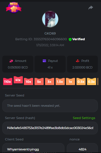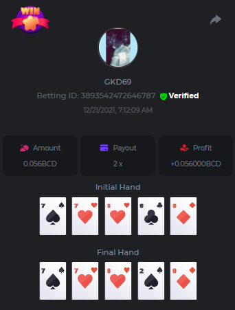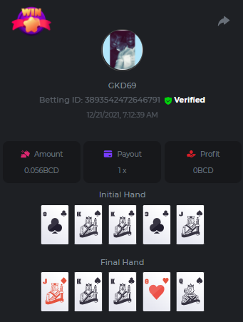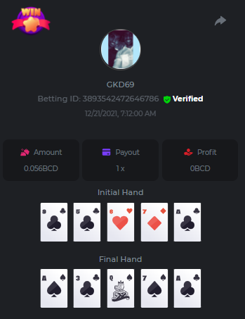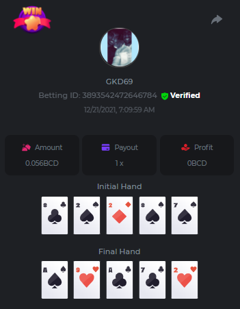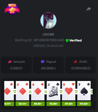 Betting ID: 4689516 (14 cards) https://bcgame-project.github.io/bcgame-blackjack/?s=YYOvj4oS%2FeLYG4tUhexnTsvIoj3ZEmAdggATvQi9Z3YEncIAbhfpyw1Q5kfB3njzOp55Ni9I53TONExCvl8Wh8sPK5PjDKpUcmtf2JWeGgrek38pxp1XVxuyB7PIq6%2FEMZh6qgLVUNZYTS3eZPcOUC0U2rc1YLWPBsSgP57nZMQ%3D&i=222768&range=127,141 ____________________________________________________________________________________________________ Betting ID: 4615658 (14 cards) https://bcgame-project.github.io/bcgame-blackjack/?s=lICcvpFFS9u%2BNgYd5yue6RN3tDUpgPdRnwerVoLeM06H8yTxmw5vvpXVpdzF7RjT%2Fh5MXTEwrdzl7CyC6rZ3y0Spf3mJ%2FlsPQqoRd2MT1NAct4FGI9H31aOGI0Lx85Wi70N4TYe1pS0Jrhyf5O8a%2B6uoNl67dsEY8z%2FTCYq9%2Bjw%3D&i=221653&range=237,251 Adding another entry cus im not sure if its eligible, however the bet is 1.25x and so it is a win technically. @digitaldash any further information about various payouts would be great, cus in BJ with insurance, splits etc the payouts could vary. ____________________________________________________________________________________________________ MASTER BONUS COMPLETED Betting ID: 4661357 (Player - 2,3,4,5,6) https://bcgame-project.github.io/bcgame-blackjack/?s=R6TLzK7mddp59iehua2Mu8Ey26Pv7MvpHXJUciGx1okbhSFQ3ZGYvJz0f%2FSQX0jxEQAWELPpD1Dgb2o7dYaEYikuSudEDMkptn0kboQoXyBQh2872kY7Z5QurjcR0tb6UKn8zfSwqeMQWZtysIwhrx1z955mrBYZDKZ3XfjCBZU%3D&i=222338&range=163,172