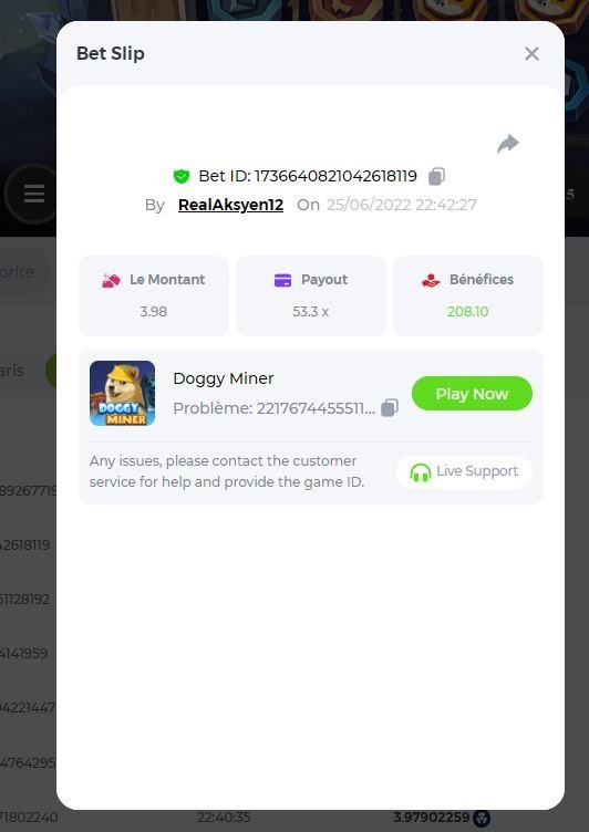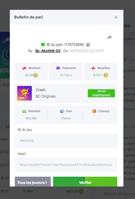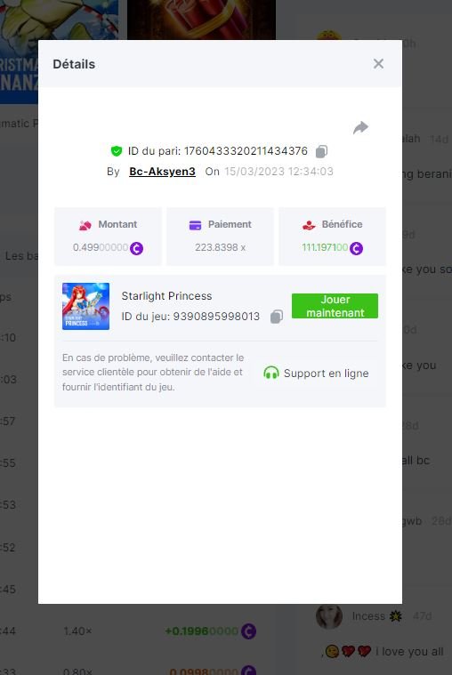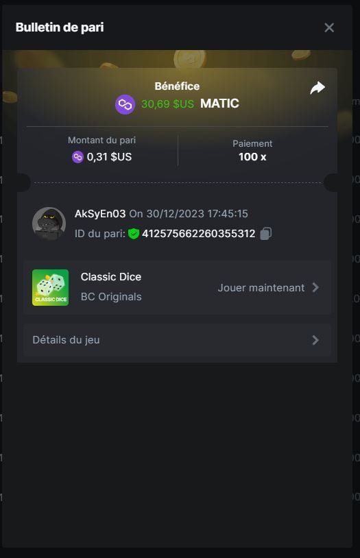 🏵ÉVÉNEMENTS DU WEEK-END🏵J'autorise tous les participants FR !!DÉFI Heure de début : 19/03/2023 à 20h00. Heure de fin : 20h le 20/03/2023 week defi n'est ce pas merveilleux ^^ Quel est le défi ? Jeu : VIDEO POKERAtteindre le plus HAUT MUTLIPLICATEUR et une cumulation de x dans le jeu VIDEO POKER Minimum pour la qualification est de 3 Multi SI égalité sur un multiplicateur , le filtre sélectionnera en 2éme la somme et sera prise en compte .VIP minimal > Il n'y a pas de niveau VIP minimum.Pari minimum : 0.0003$ Attention JB non pris en compte Récompenses14$8$4$4eme place à 7 -ème place 2$ sans respect des conditions aucun gains ne sera remis !Accédez au jeu pour choisir votre ID de pari, cliquez sur l'icône Partager (↷) puis sur Copier le lien Dans le même message, téléchargez une capture d'écran de votre gain en cliquant sur l'ID du jeu et En mode USD ON1. N'utilisez pas plusieurs comptes 2. Les paris soumis avant ou après la date et l'heure limite ne seront pas acceptés 4. tout manquement au conditions de bonus, vera son paris annulé. alors lisez bien avant de commencer et BC Game vous souhaite des moments heureux et profitablesBonne chance, que le meilleurs gagne !!