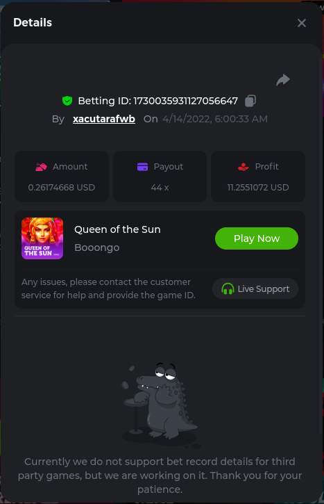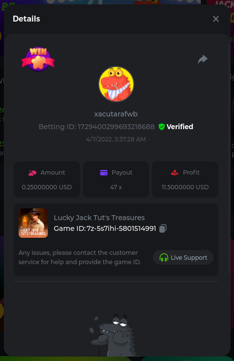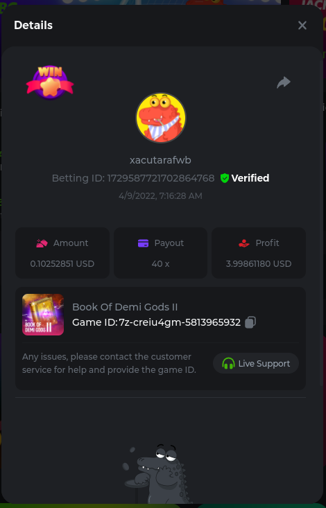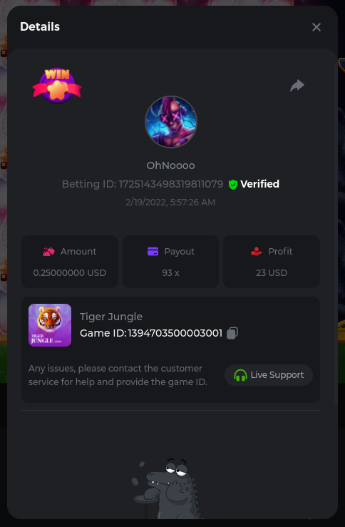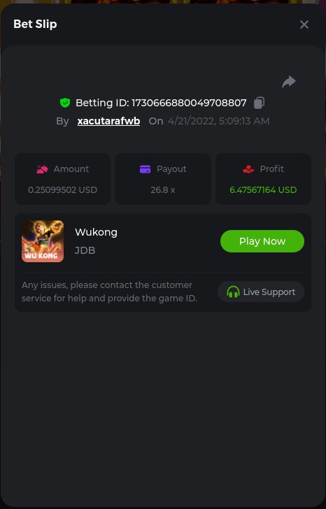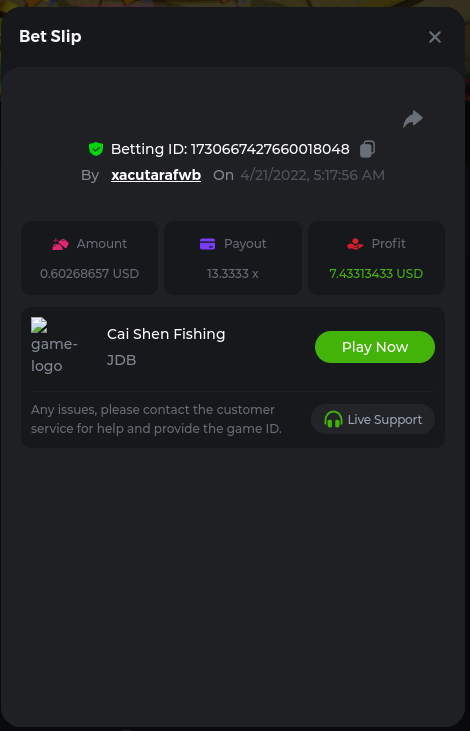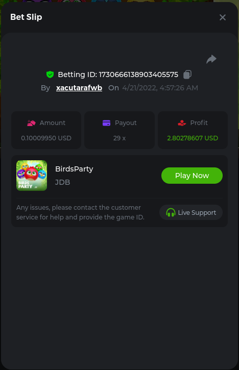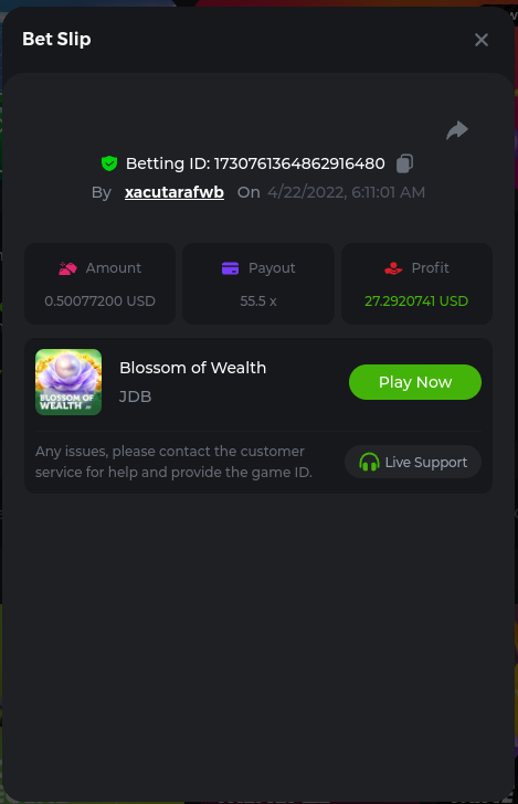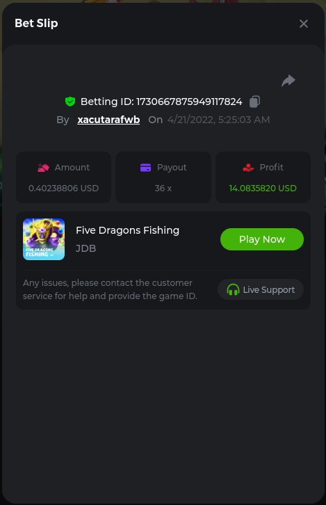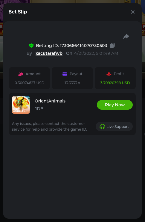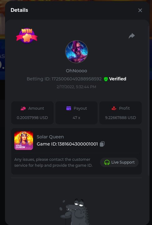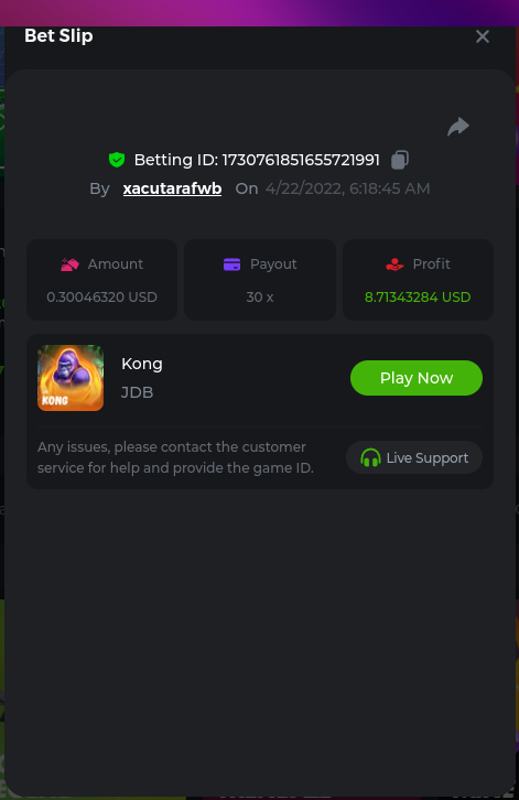 22. Golden Dancing Lion x 177.2 Betting ID: 1724947781266571904 Hit the Gold! x 44.8 Betting ID: 1724948222505448576 Tiger Jungle x 93 Betting ID: 1725143498319811079 Solar Queen x 47 Betting ID: 1725006049288958592