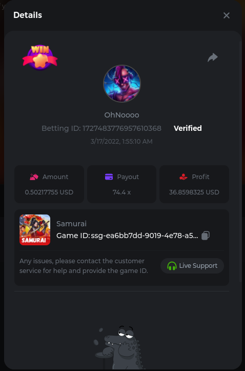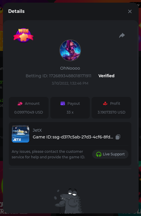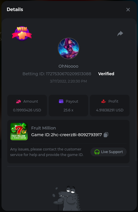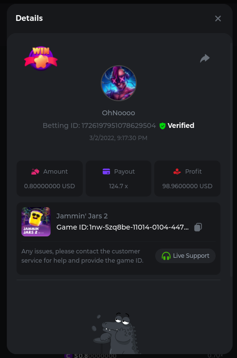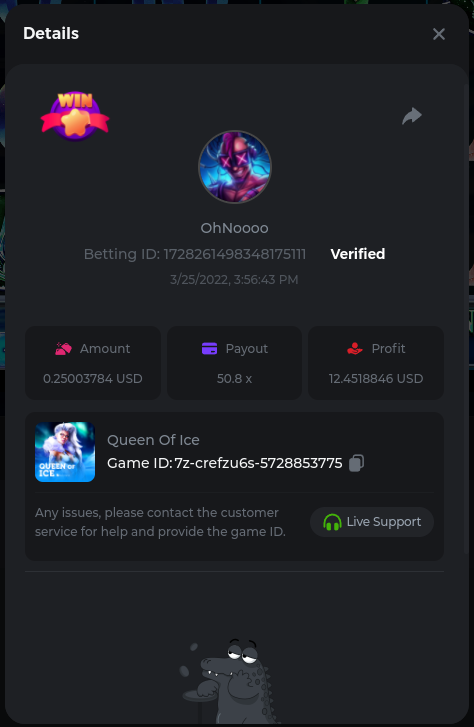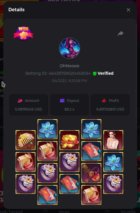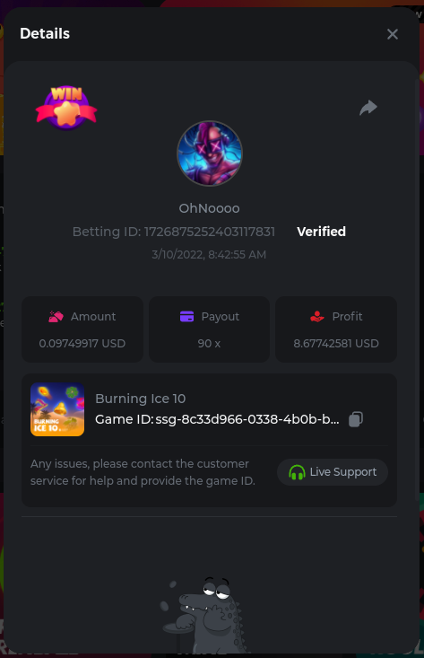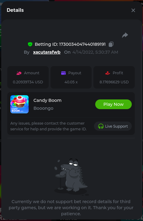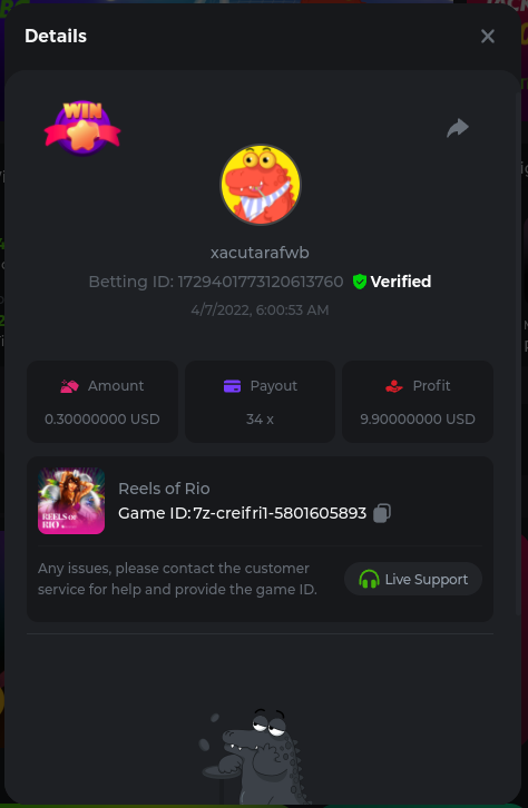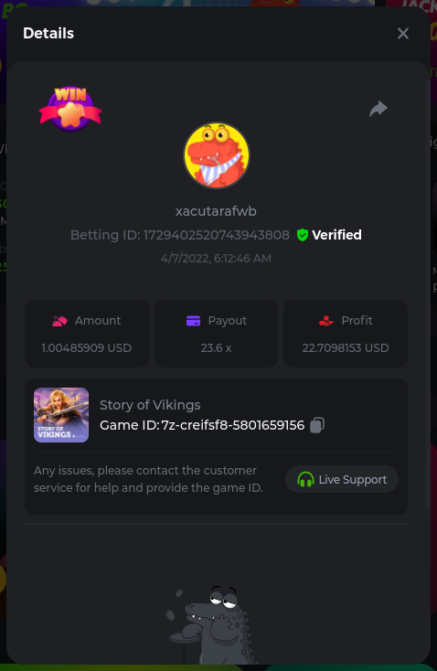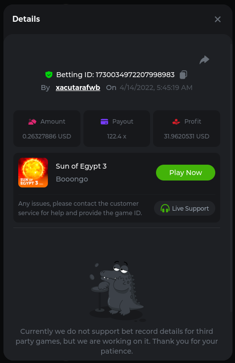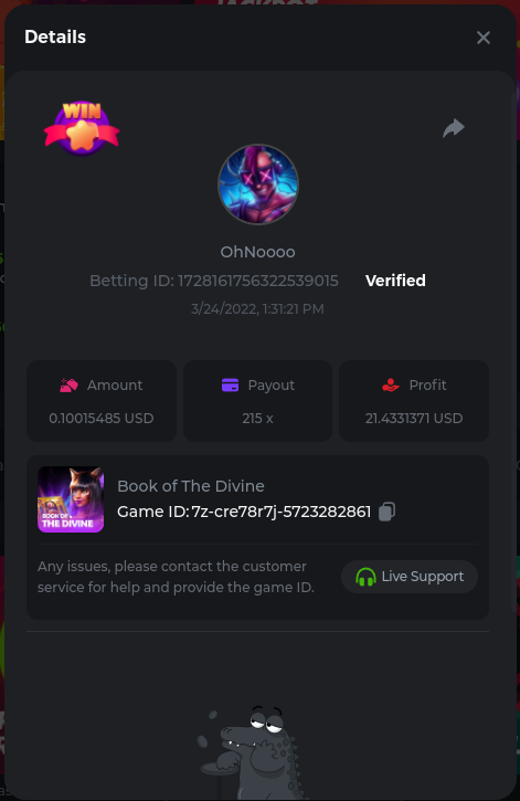 22. Golden Dancing Lion x 177.2 Betting ID: 1724947781266571904 Hit the Gold! x 44.8 Betting ID: 1724948222505448576 Tiger Jungle x 93 Betting ID: 1725143498319811079 Solar Queen x 47 Betting ID: 1725006049288958592