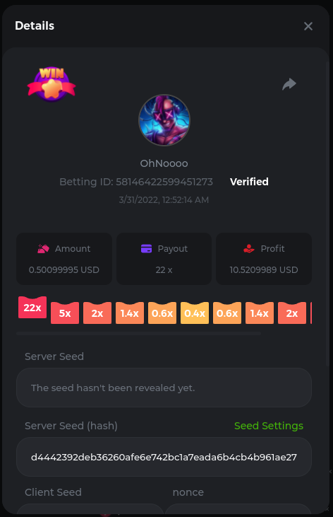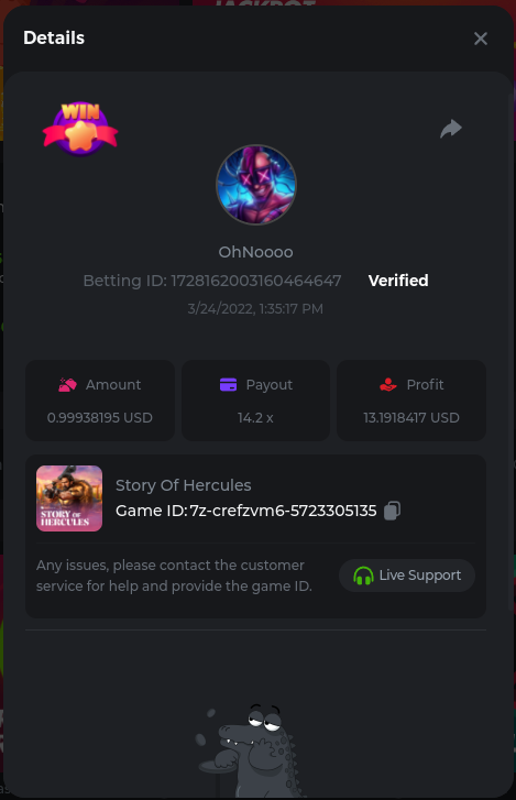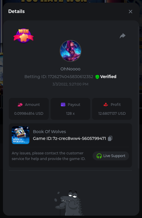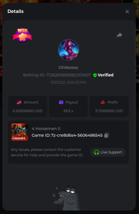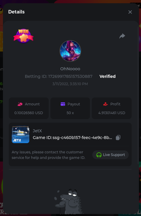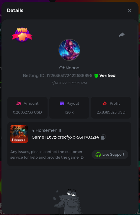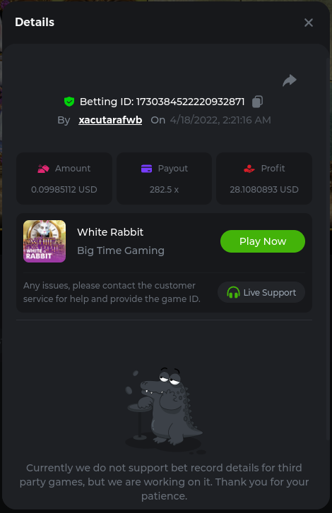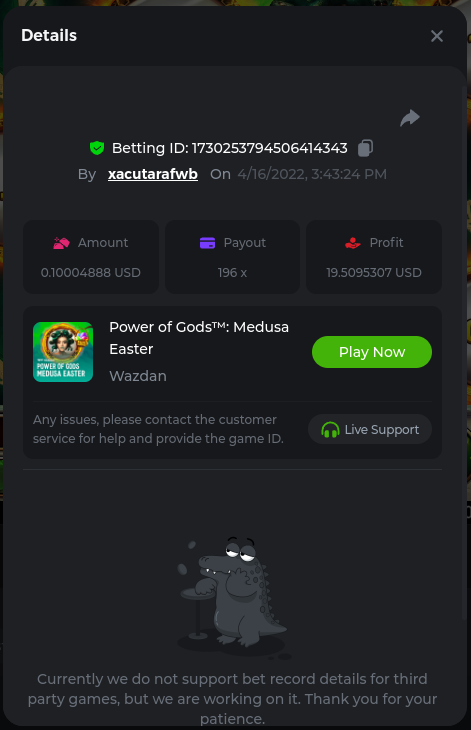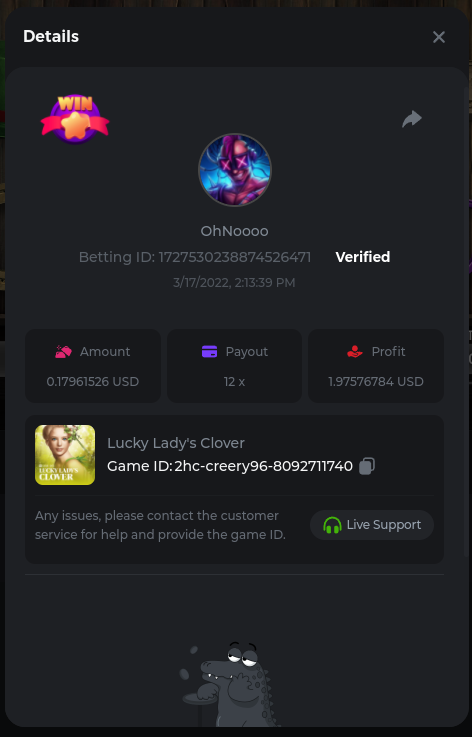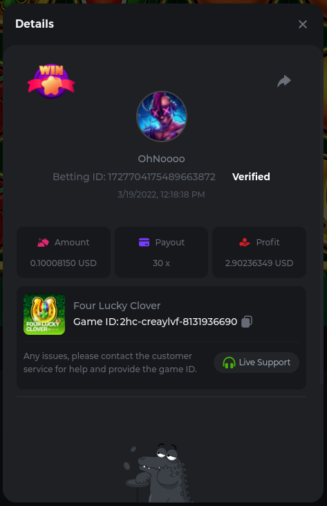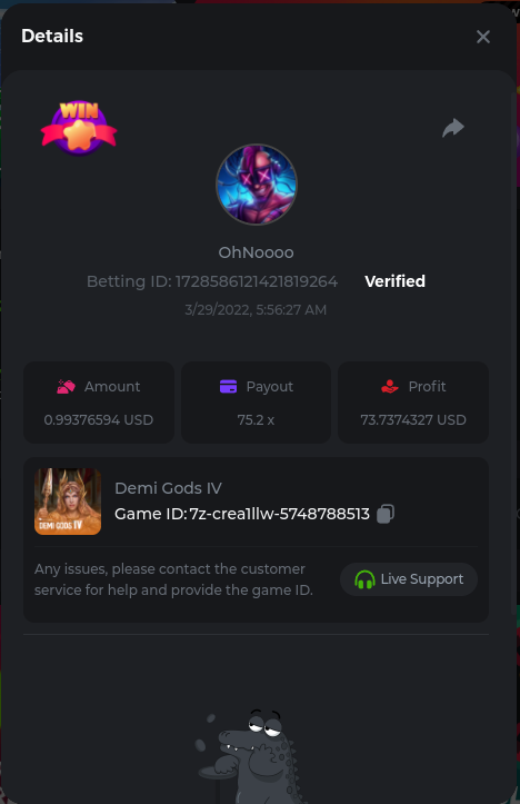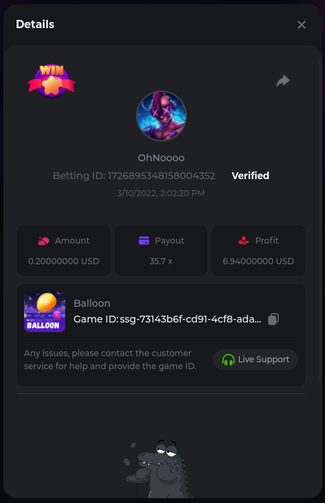 22. Golden Dancing Lion x 177.2 Betting ID: 1724947781266571904 Hit the Gold! x 44.8 Betting ID: 1724948222505448576 Tiger Jungle x 93 Betting ID: 1725143498319811079 Solar Queen x 47 Betting ID: 1725006049288958592