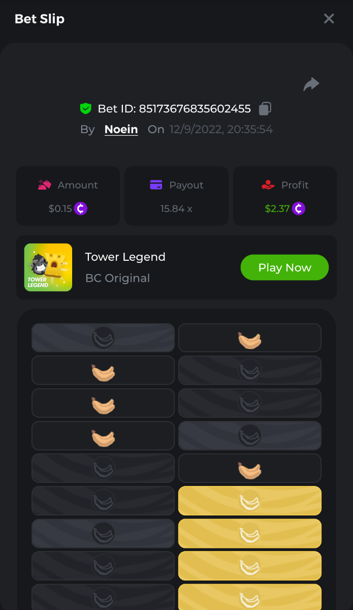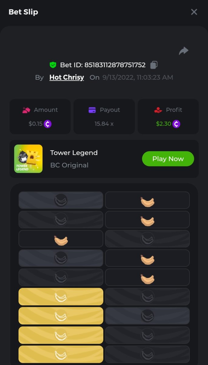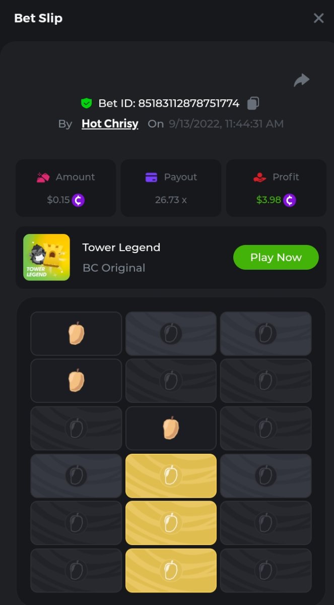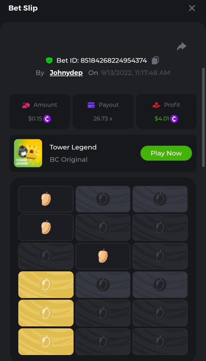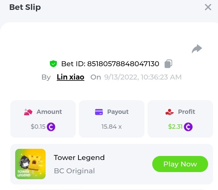Event Team Niobium Posted September 12, 2022 Event Team Share Posted September 12, 2022 $2.5k Prestige Tower Legend Challenge #46 ♜ Starts: 12, September 8:30pm GMTEnds: 19, September 8:30pm GMT Hello VIPs! Our weekly event is back and better than ever, so get ready to play some Tower Legend! The Top 10 players of the week will receive a major reward, and other participants will also get rewarded for their efforts! But that's not all, anyone who completes the extra bounty will receive an equal share of the $500 prize pool. Come join us, have some fun, and maybe you'll end up at the Top! — More details are given further on. What's the Challenge? Win the highest multiplier you can on BC.Game's in-house game, Tower Legend. (Any difficulty is valid). If there is a tie, the player with the higher average bet amount (in USD) shall be the winner. If there is a tie in the amount and payout, the one who posted or edited his post first will be considered in the Ranking. Minimum VIP There's no minimum VIP level Minimum Payouts Minimum payout to qualify is 15x Minimum Bet Size $0.15 USD equivalent Eligible Coins All cryptocurrencies are eligible (excepting JB) Available Prizes 1st Place....... $500 2nd Place..... $300 3rd Place...... $200 4th Place......$100 5th Place......$50 6th-10th.........$30 All other participants.........$700 Bounty Prize...$500, equal share. EXTRA BOUNTY Post a winning bet with 253.44x multiplier or above and receive an equal share of the $500 prize pool! Original rules apply with all minimum requirements. How to Enter To enter, copy the link of the bet you'd like to submit. Once you've copied it, paste it as a reply to this thread like so: Link: https://bc.game/sd/?sd=10SURLKVEOZRPV In the same post, upload a screenshot of your win by clicking the game ID WITH VIEW IN USD mode ENABLED (accessible at the bottom of dropdown menu for your wallet up top. This way, we can ensure that your bet indeed met the minimum requirement at the time of placing it: Link: https://bc.game/sd/?sd=10SURLKVEOZRPV Please combine all of your hits together in a SINGLE post. Edit your existing post for additional hits, don't create a new post. Each eligible entry must have the Bet Slip URL, failure to include it will disqualify participation in the event. Bet Slip image is not mandatory. Bets must be posted within 24 hours of placing bet in order to keep things fair for everyone. Bets must be made during the specified time window stated above. This thread will lock automatically when the time period is over. One (1) entry per household. Anyone found attempting to win multiple prizes will be disqualified from this challenge as well as all future challenges. Failure to follow instructions will result in your submission being null and void. By entering this challenge, you acknowledge that BC.Game has the final decision on results and placement. Payouts will be made within 72 hours of challenge completion, please be patient, we promise you that we haven't forgotten. We check and double check to make sure the rightful winners receive their prize. Prizes will be paid out in BCD. Good luck everyone! Link to comment Share on other sites More sharing options...