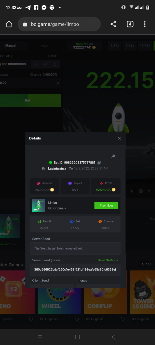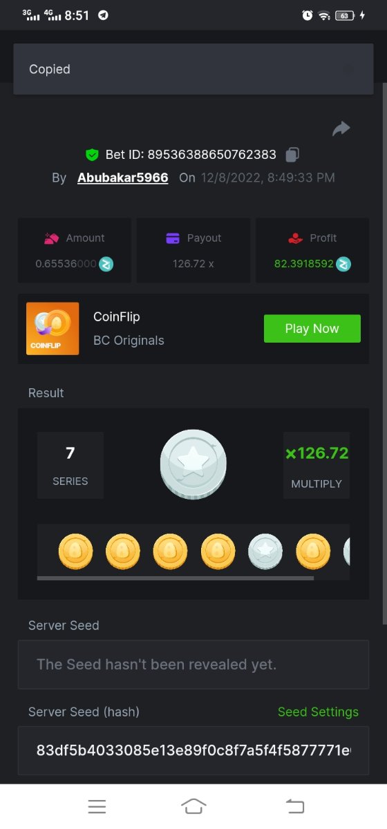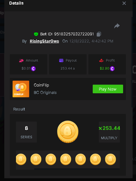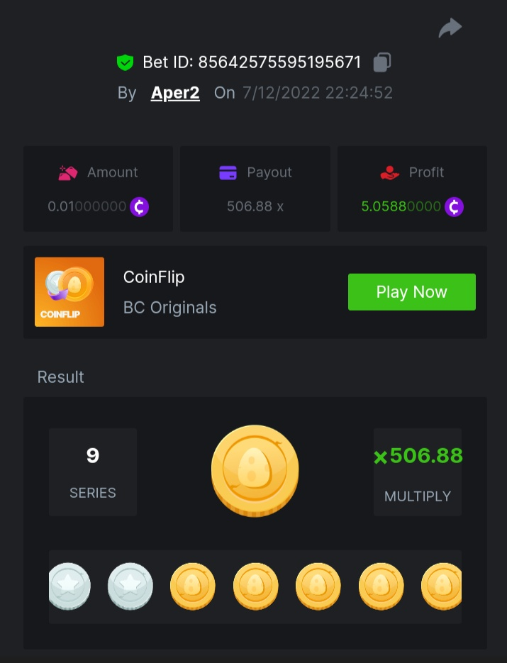 Black Tiger Posted December 8, 2022 Share Posted December 8, 2022 (edited) Read Carefully Before Start To Hunt Daily Challenges #93: COINFLIPHunt :Win the highest pay outMin Payout requirement 100xMin Level 4️Duration Starting : Now End time : 23.59 UTC Time How to Join? Make screenshot + paste your bet link + UID or Profile link Mini bet amount - 0.01$ Any coin allowedReward Prizes 1st Place....... $7 BCD2nd Place..... $5 BCD3rd Place...... $4 BCD 🎖4th Place......$3 BCD5th - 10th Place......$1 BCD 🏵 Winners will be announcing next day after Roll Point Edited December 9, 2022 by Black Tiger Link to comment Share on other sites More sharing options...