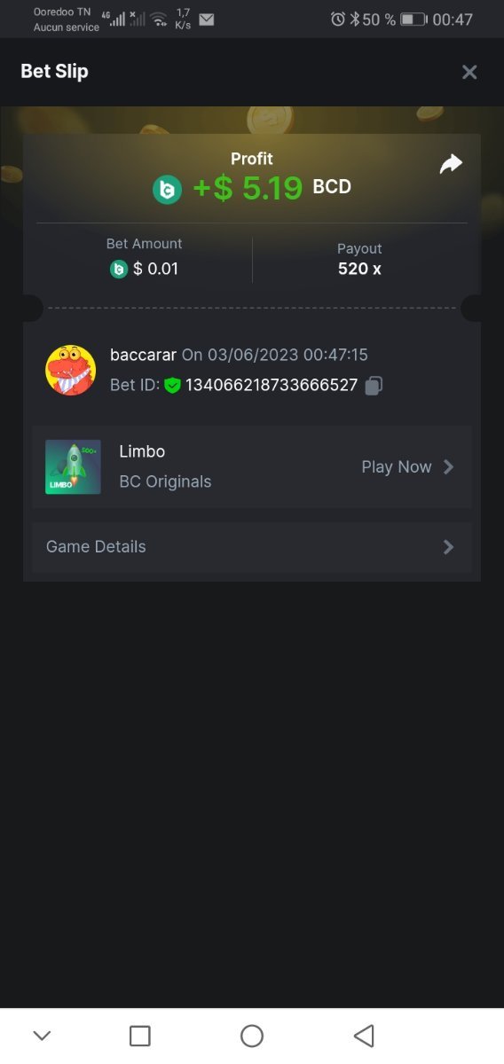 Maksypro Posted June 2, 2023 Share Posted June 2, 2023 Read Carefully Before Start To Hunt Daily Challenges #254 LIMBO Hunt : Win the highest multiplier Min Multiplier requirement 100x Min Level 4 ๏ธDuration Starting : Now End time : 23.59 UTC Time How to Join? Make screenshot + paste your bet link + UID or Profile link Any coin, with min bet 0.01 USD is allowed (jb/bb/bcl not allowed) Reward Prizes 1st Place.....$7 BCD 2nd Place.....$5 BCD 3rd Place.....$4 BCD 4th Place.....$3 BCD 5th Place.....$2 BCD ๐ต Winners will be announcing next day after Roll Point! 2 Link to comment Share on other sites More sharing options...