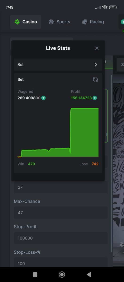 BC_BD_Energy1 Posted July 29, 2023 Share Posted July 29, 2023 Here's the hashdice script that ive been usingsl that i've been rather happy with so far, it uses minim bet amount and make sure to have a decent sized bankrol when you run this script. Goodluck and share some love out of rspllespect. var config = { scriptTitle: {label: '//////// Script by BeesH-RSA | UID 3198768 - Dont be an ass, share some love!\\\\\\\ ) ', type: 'title'}, baseBet: {label: 'Starting Bet:', value: 0.000055, type: 'number'}, baseBet: { label: 'Base Bet', value: currency.minAmount, type: 'number' }, startingChance: { label: 'Starting Chance', value: 0.01, type: 'number' }, } var chance = config.startingChance.value; var currentPayout = ((1/chance)*99); var losecount = 0; var betcount = 0; var varix = 1.025; var previousBet = currentBet; var runningbalance = currency.amount; var originalbalance = currency.amount; var baseBet = config.baseBet.value; var currentBet = baseBet; function main () { game.onBet = function () { game.bet(currentBet, currentPayout).then(function(payout) { runningbalance -= currentBet; previousBet = currentBet; betcount += (1); if (payout > 1) { var netwin = currentBet * currentPayout; runningbalance += netwin; currentBet = baseBet; losecount = 0; chance = 0.1; varix = 1.025; } else { if (losecount >= 190) { varix = 1.05; } if (losecount >= 260) { varix = 1.066; } losecount += (1); currentBet = (previousBet * varix); chance += (0.01); } currentPayout = ((1/chance)*99); if (betcount % 100 == 0) { logSummary(); } log.info('Betting: ' + currentBet.toFixed(7) + ' ' + ' X ' + ' ' + currentPayout.toFixed(2)); }); } } function logSummary() { var netNumber = runningbalance - originalbalance; var netPecentage = (netNumber / originalbalance) * 100; if (originalbalance < runningbalance) { log.success('Total Profit: ' + netNumber.toFixed(7) + '(' + netPecentage.toFixed(2) + '%)'); } else { log.error('Total Profit: ' + netNumber.toFixed(7) + '(' + netPecentage.toFixed(2) + '%)'); } } Link to comment Share on other sites More sharing options...