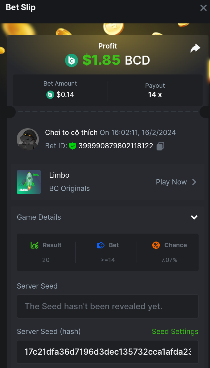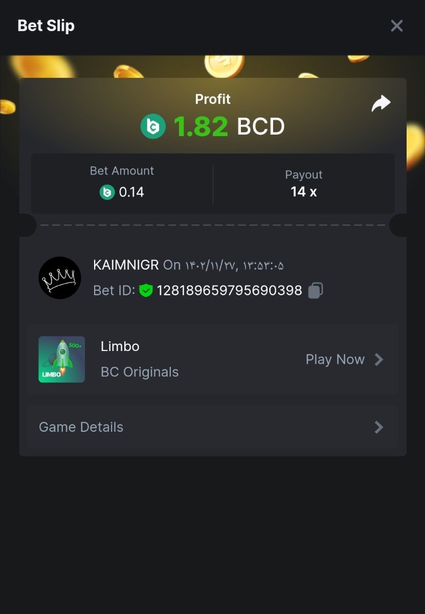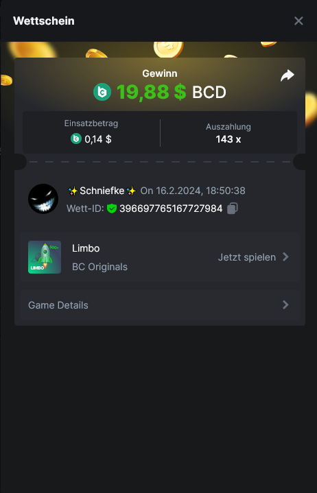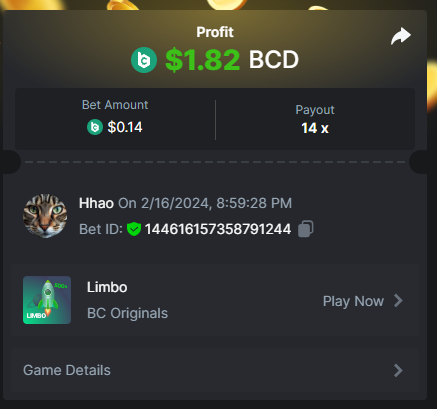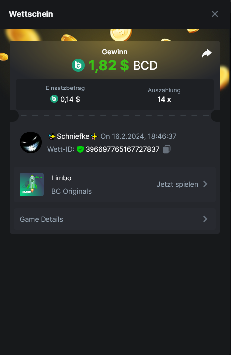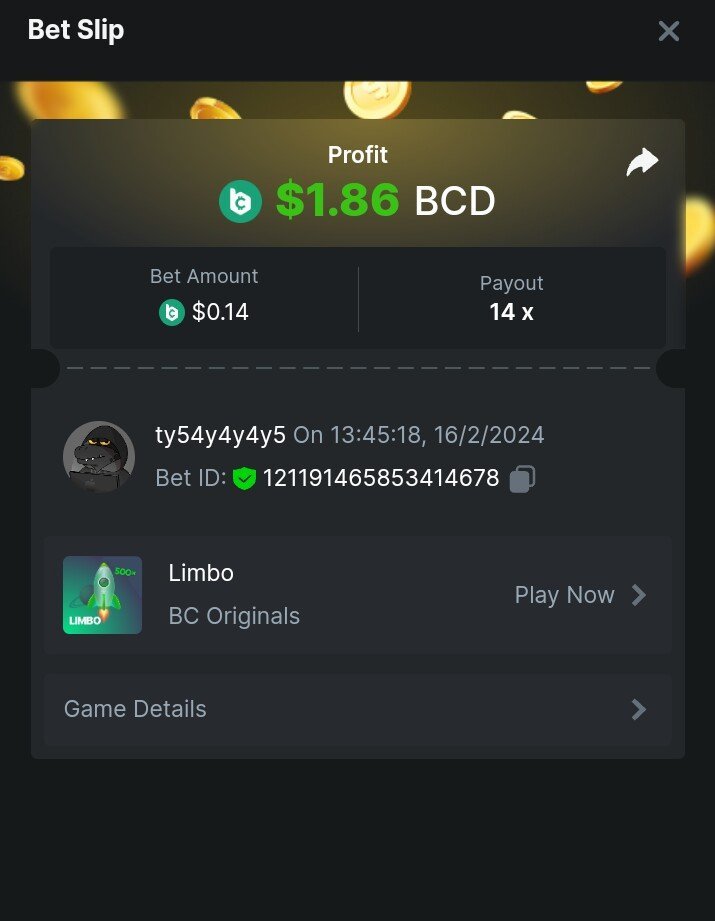 GOLFYUIDEE Posted February 16, 2024 Share Posted February 16, 2024 On 2/14/2024 at 5:08 PM, BCGame_Maxim said: Β Love & Luck Challenge: Valentine's Joys Duration: February 14th - February 21st 14:15 UTC This Valentine's Day, we are celebrating the endless love of LimboΒ with a spectacular $5,000 prize pool. Dive into the Love & Luck Challenge, where romance meets excitement in our exclusive in-house Limbo game. With fortunes waiting to be claimed and love in the air, seize the chance to win big and spread the joy of Valentine's Day! Don't miss out on this romantic opportunity to win big and embrace the spirit of Valentine's Day at BCGame Originals. May the love be with you, and may luck be forever in your favor! Β WHAT IS THE CHALLENGE? Win big with Limbo and our special Valentine's Day multipliers:Β 14x, 143x, 1434x, and 14314x! The more you hit the above love multipliers with lovely luck, the greater your chances of winning. The player with the most multiplier will stand in top ranks. If there's a tie, the player with the higher average bet amount (in USD) shall be the winner. If there is a tie in the amount and payout, the one who posted or edited his post first will be considered in the ranking. HOW TO ENTER Simply play BCGAMEβs Original inhouse LIMBO game during the challenge period to hunt these payouts. To enter, copy the link of the bet you'd like to submit. Once you've copied it, paste it as a reply to this thread like so: Link: https://bc.game/#/sd/11SMK649VPQAYR In the same post, upload a screenshot of your win by clicking the game ID WITH VIEW IN USD mode ENABLED (accessible at the bottom of dropdown menu for your wallet up top. This way, we can ensure that your bet indeed met the minimum requirement at the time of placing it: Link: https://bc.game/#/sd/11SMK649VPQAYR MINIMUM LEVEL Minimum VIP 8Β with phone verified will be eligible! MINIMUM PAYOUT 14x at LimboΒ toΒ qualify for prizes! MINIMUM BET AMOUNT $0.14 equivalent or higher ELIGIBLE COINS All cryptocurrencies are eligible (excepting JB)Β AVAILABLE PRIZESΒ BOUNTY Bounty Hunt: Bet $1.4+ in Limbo, find the 141.4x multiplier, and share up to $300 or max $25Β per winner. Join the love-filled adventure now! Β GENERAL TERMS Please combine all of your hits into a single post. Edit your existing post for additional hits; don't create a new post. Each eligible entry must have the Bet Slip URL; failure to include it will disqualify participation in the event. The Bet Slip image is not mandatory. Bets must be postedΒ within 24 hoursΒ of placing the bet in order to keep things fair for everyone. Bets must beΒ made during the specified time windowΒ stated above. This thread will lock automatically when the time period is over. OneΒ (1)Β entryΒ per household. Anyone found attempting to win multiple prizes will be disqualified from this challenge as well as all future challenges. Failure to follow the instructions will result in your submission being null and void. By entering this challenge, you acknowledge that BC.Game has the final say on results and placement. Payouts will be distributed after the event is finished. Please note that it could take anywhere between 3Β to 7 days after the completion of the event. https://bc.co/#/sd/11SRJVV7SWIQ5F Link to comment Share on other sites More sharing options...