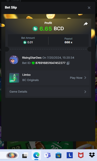 Moderator Giandreas Posted July 20, 2024 Moderator Share Posted July 20, 2024 Read Carefully Before Start To Hunt Forum Daily Challenges #667Hunt : Limbo Win the highest pay out Min Payout : x20 Min Level 10 ️Duration Starting : Now End time : 23.59 UTC Time How to Join? Make screenshot + paste your bet link + UID or Profile link Any coin, with min bet 0.01 USD is allowed (jb/bb/bcl not allowed) Reward Prizes 1st Place.....$7 BCD 2nd Place.....$5 BCD 3rd Place.....$4 BCD 4th Place.....$3 BCD 5th Place.....$2 BCD 🏵 Winners will be announcing next day after Roll Point! Link to comment Share on other sites More sharing options...