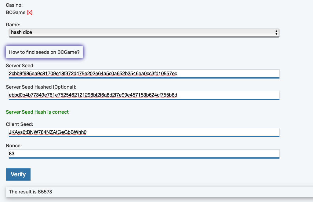 BCGame_POP Posted May 28, 2022 Share Posted May 28, 2022 @Mosjfbiofwbheya, I verified the fairness of your other bet you mentioned. The result on the fairness tool is accurate. Looks like you made some mistake for your first bet you posted while verifying. the verifier is working perfectly fine. Link to comment Share on other sites More sharing options...